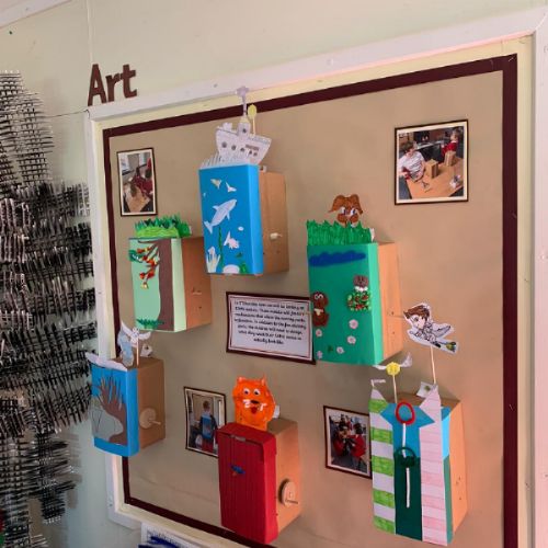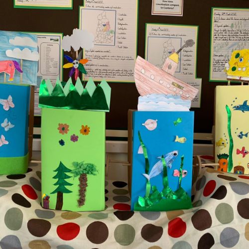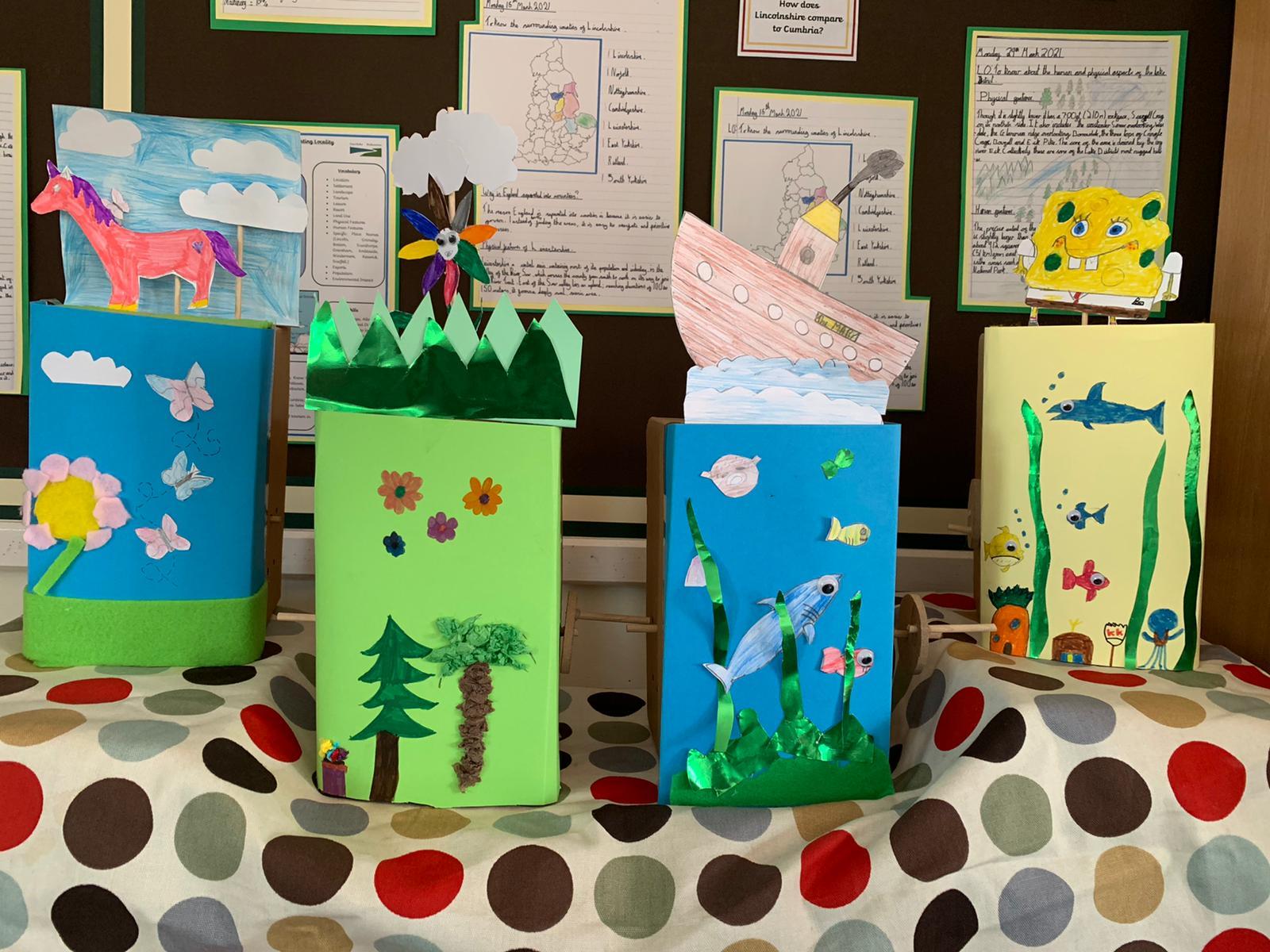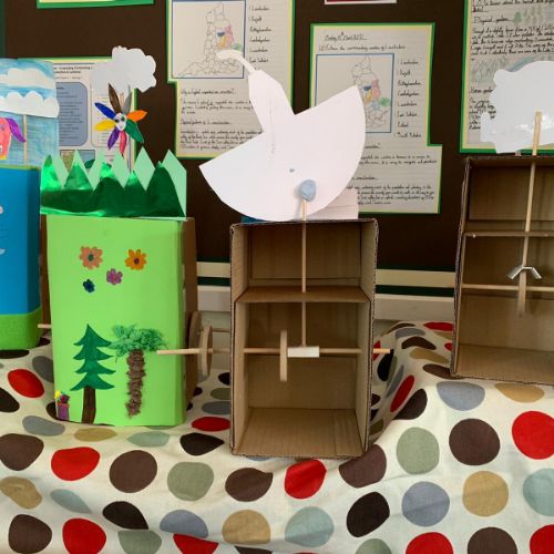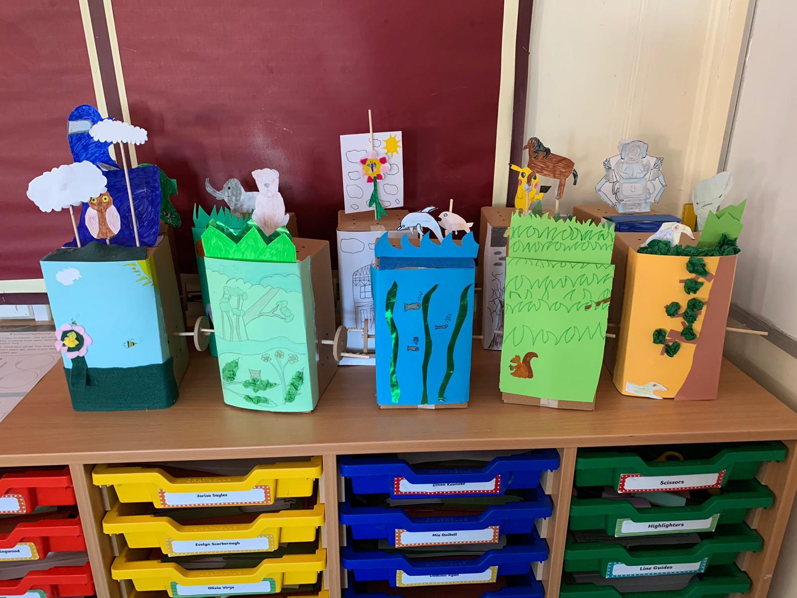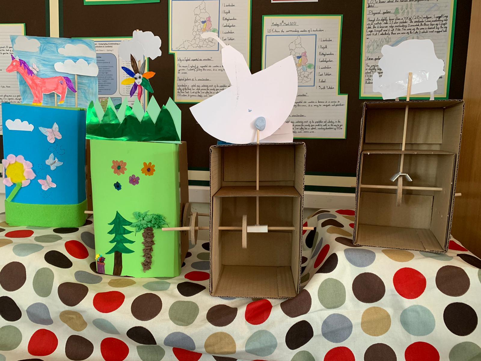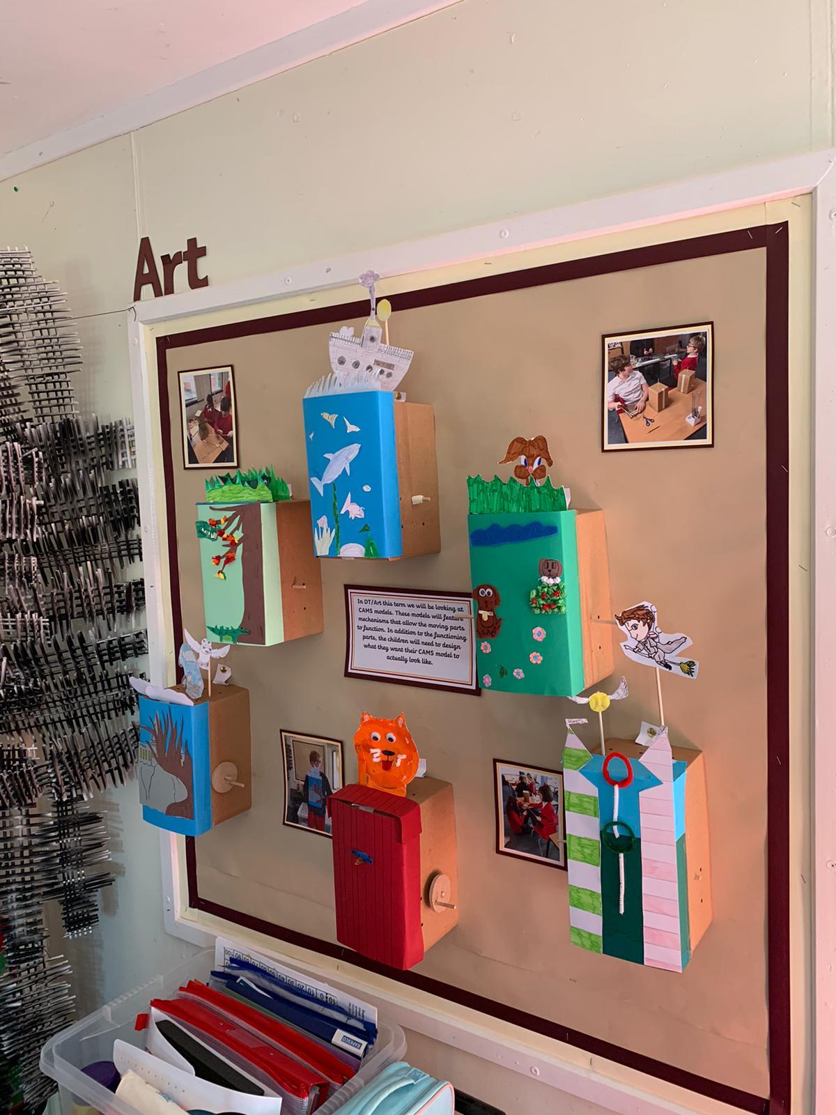 Design technology, cams and mechanisms unit. The class made working automaton scenes.
